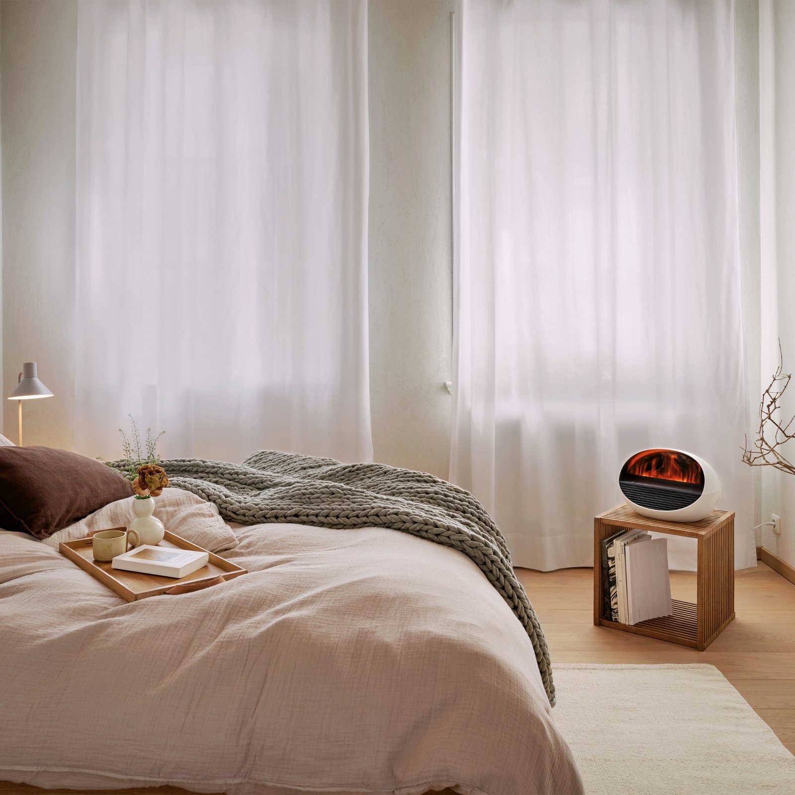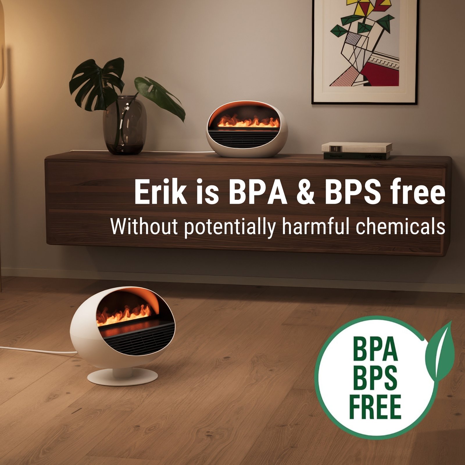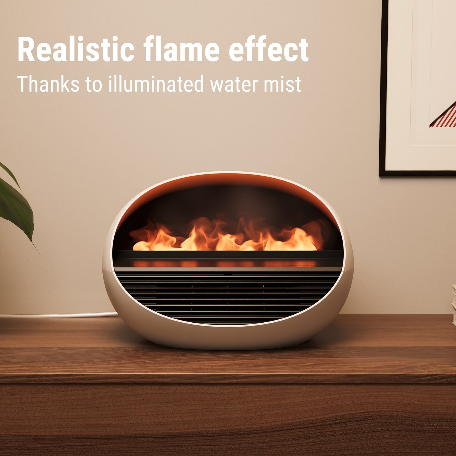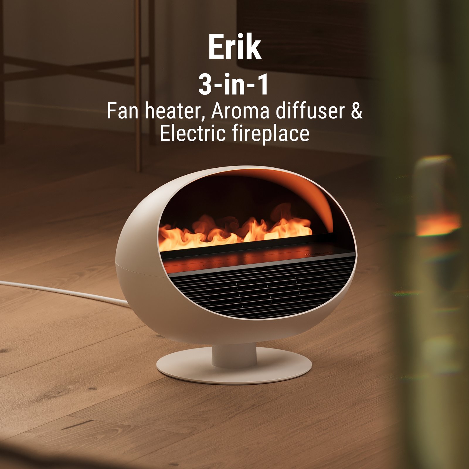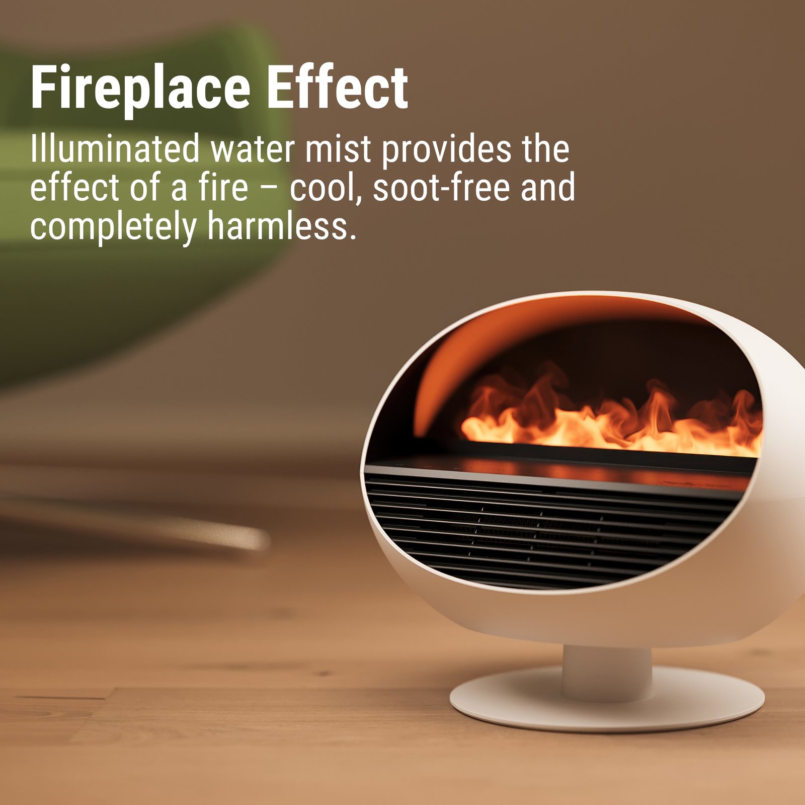 • Fireplace atmosphere: with the illuminated water mist, Erik creates a realistic effect fire; if the fan heater function is activated, Erik provides a cosy fireplace atmosphere with the outflowing heat